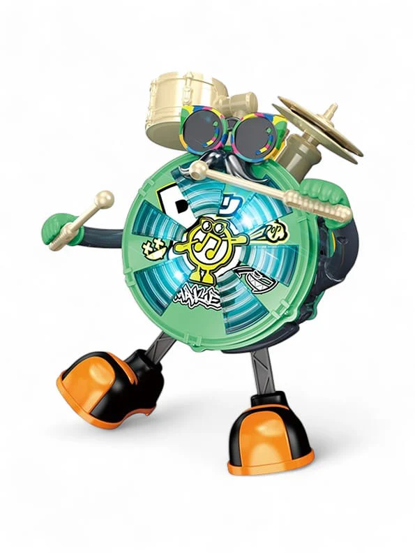 يقدّم مستر روك العازف عرضًا موسيقيًا لطيفًا مع حركات جذابة وأنوار ملوّنة تثير انتباه الطفل وتشجّعه على التفاعل.