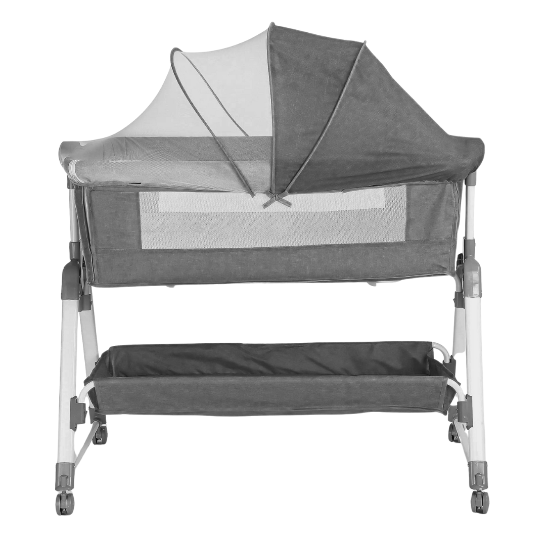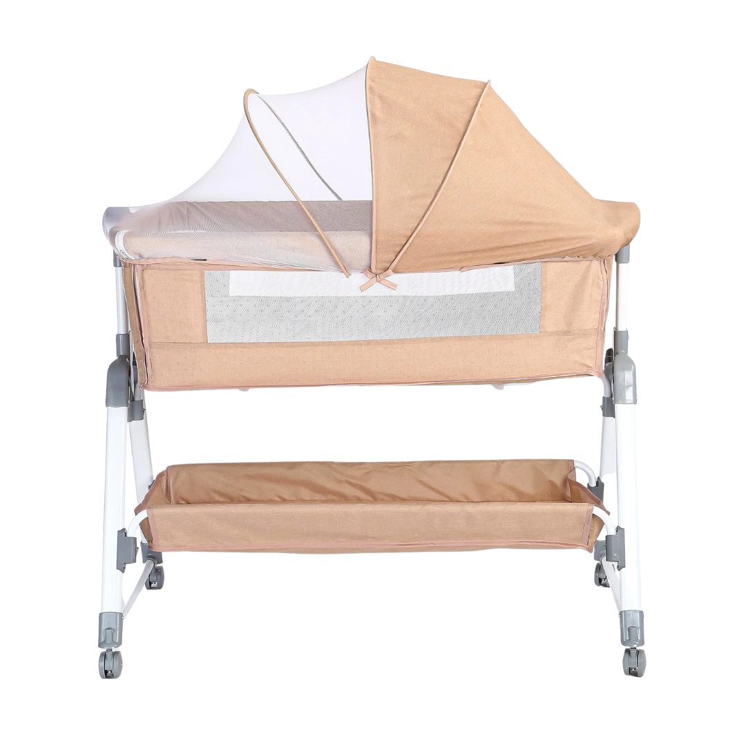 يدعم السرير مستويين للارتفاع لتعديل الارتفاع بسهولة حسب ارتفاع سرير الأم، ويحتوي على جانب قابل للفتح ليعمل كسرير ملاصق، مما يجعل الوصول للطفل أسهل أثناء الليل. كما يأتي مزودًا بـ علاقة ألعاب موسيقية لإبقاء الطفل مشغولاً ومسترخيًا، إلى جانب ناموسية قابلة للفك للحماية من الحشرات.