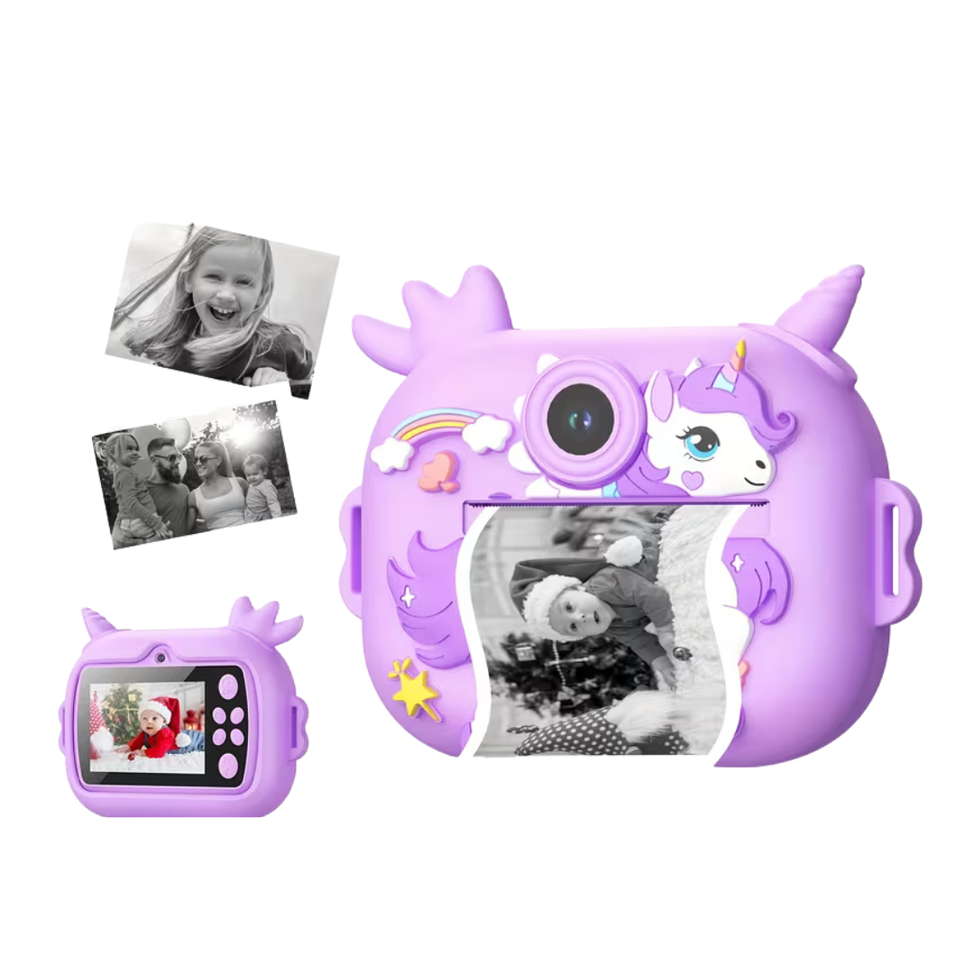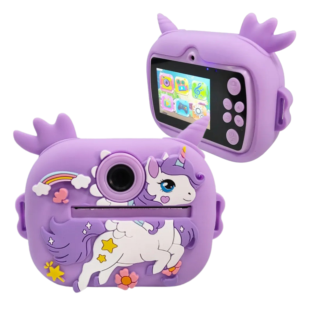 كاميرا رائعة بتصميم اليونيكورن المحبوب، تجمع بين التصوير الممتع والطباعة الفورية للصور.